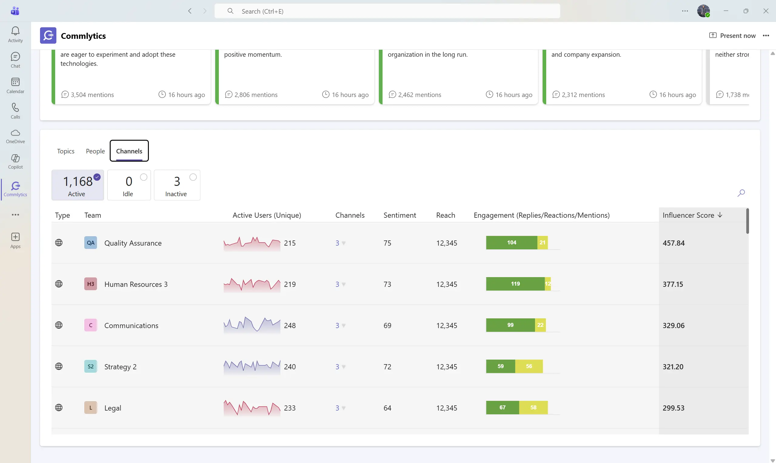 With so many Teams, Channels and Chats, how do you know which are active, which people engage with most, and which are just clutter? With Commlytics, you’ll be able to see a consistent score based on recency, frequency, sentiment and engagement, enabling better governance, auditing and clean-up.